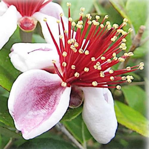フェイジョアは、パイナップルグアバとも呼び、果実はパイナップルとバナナとリンゴを混ぜたような味で甘い香りを漂わせます。食べるとキウイフルーツよりも甘くて美味しいと、ここ数年、人気のある果樹です。エキゾチックで美しい華やかな花も食用に利用できます。