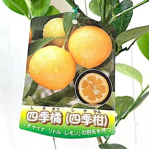 四季柑は、チャイナリトルレモン、四季橘柑とも呼ばれていて、ミカンと金柑の雑種で、年中実をつけます。金柑より多少大きいくらいの比較的小さな実ですが、栄養が詰まっています。1本で結実します。
